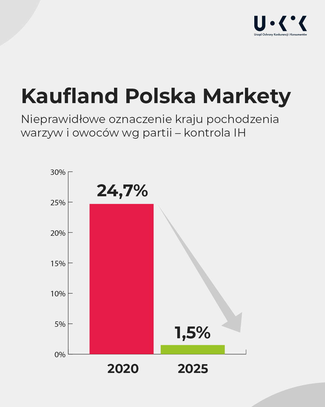 Po tym, jak do UOKiK zaczęły wpływać skargi konsumentów na błędy w oznakowaniu krajem pochodzenia warzyw i owoców, Prezes UOKiK postanowił sprawdzić, jak sklepy o tym informują. Wszczął w 2020 r. postępowania przeciwko Jeronimo Martins Polska (JMP), właścicielowi sklepów Biedronka, oraz Kaufland Polska Markety. Kontrole Inspekcji Handlowej potwierdziły, że klienci właśnie tych sieci byli wprowadzani w błąd.Informacje na wywieszkach różniły się od tych podanych na opakowaniach czy wynikających z dokumentów dostawy. Nieprawidłowości występowały w 27,8 proc. sklepów Biedronka i 38 proc. sklepów Kaufland skontrolowanych przez Inspekcję Handlową.