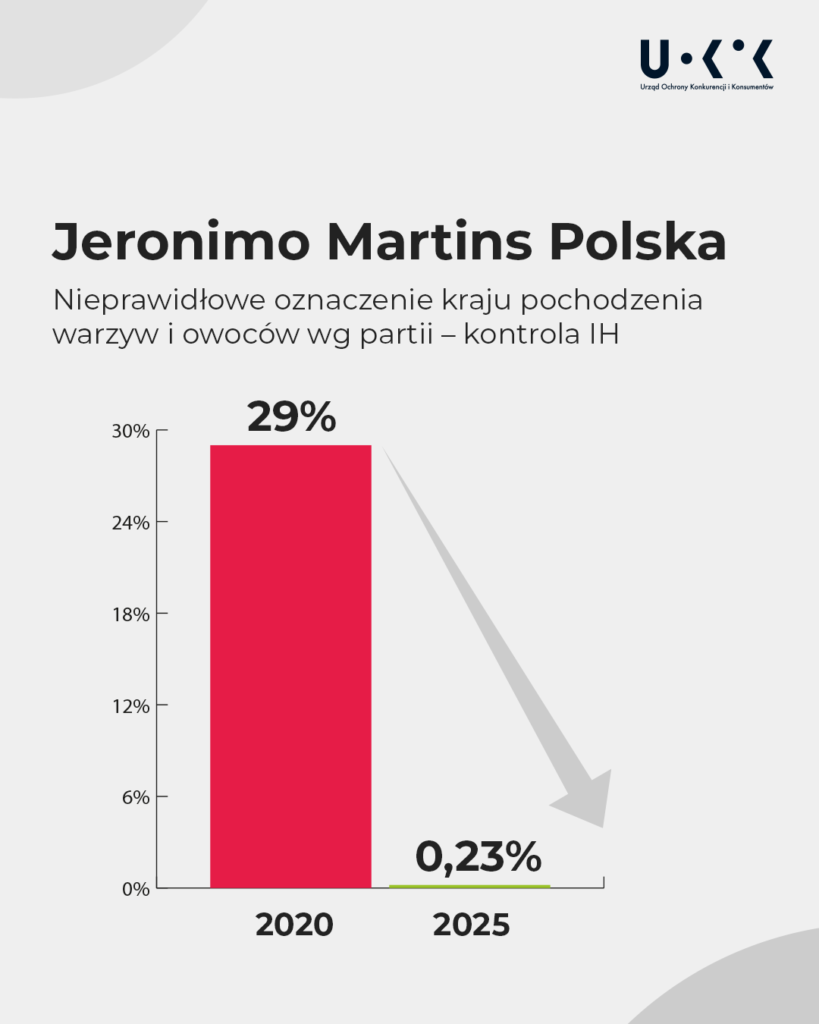W trzecim i czwartym kwartale 2025 r., po uprawomocnieniu się decyzji Urzędu, IH ponownie sprawdziła oznakowanie kraju pochodzenia warzyw i owoców: nieprawidłowości dotyczyły już niespełna 1 proc. (od 0,23 proc. do 0,73 proc.) skontrolowanych partii.
