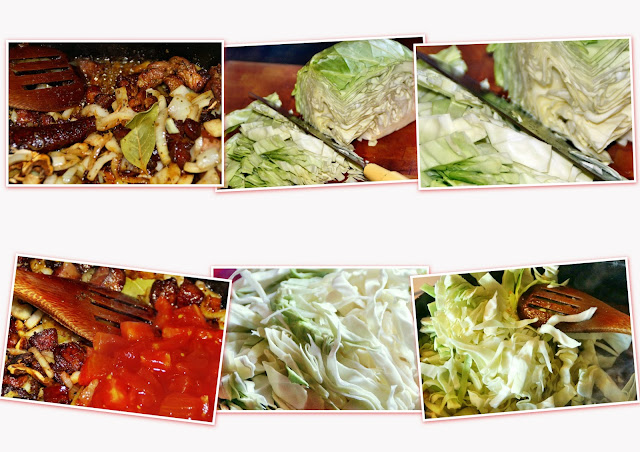 W rozgrzanej brytfannie smażymy słoninę wędzoną i boczek dodajemy ziele angielskie i pieprz w ziarnach oraz pokrojoną w kosteczkę kiełbasę na koniec dodajemy cebulę jak już wszystkie składniki odpowiednio zostaną podsmażone (wg uznania mniej lub bardziej wysmażone) dodajemy pokrojone w kostkę pomidory lub koncentrat pomidorowy po 5 -10 minutach dodajemy posiekaną młodą