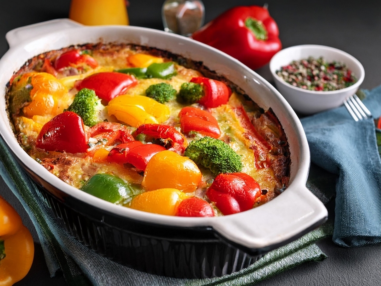 To lekka wersja zapiekanki, idealna dla osób szukających prostego i zdrowego dania. Jeśli jednak masz ochotę na bardziej sycący posiłek, dodaj ugotowany makaron (np. penne) albo cienko pokrojone i podgotowane ziemniaki. Wystarczy dodać je razem z warzywami przed zalaniem mieszanką jajeczną. Dzięki temu zapiekanka zyska na treściwości, pozostając równie smaczną i kolorową.